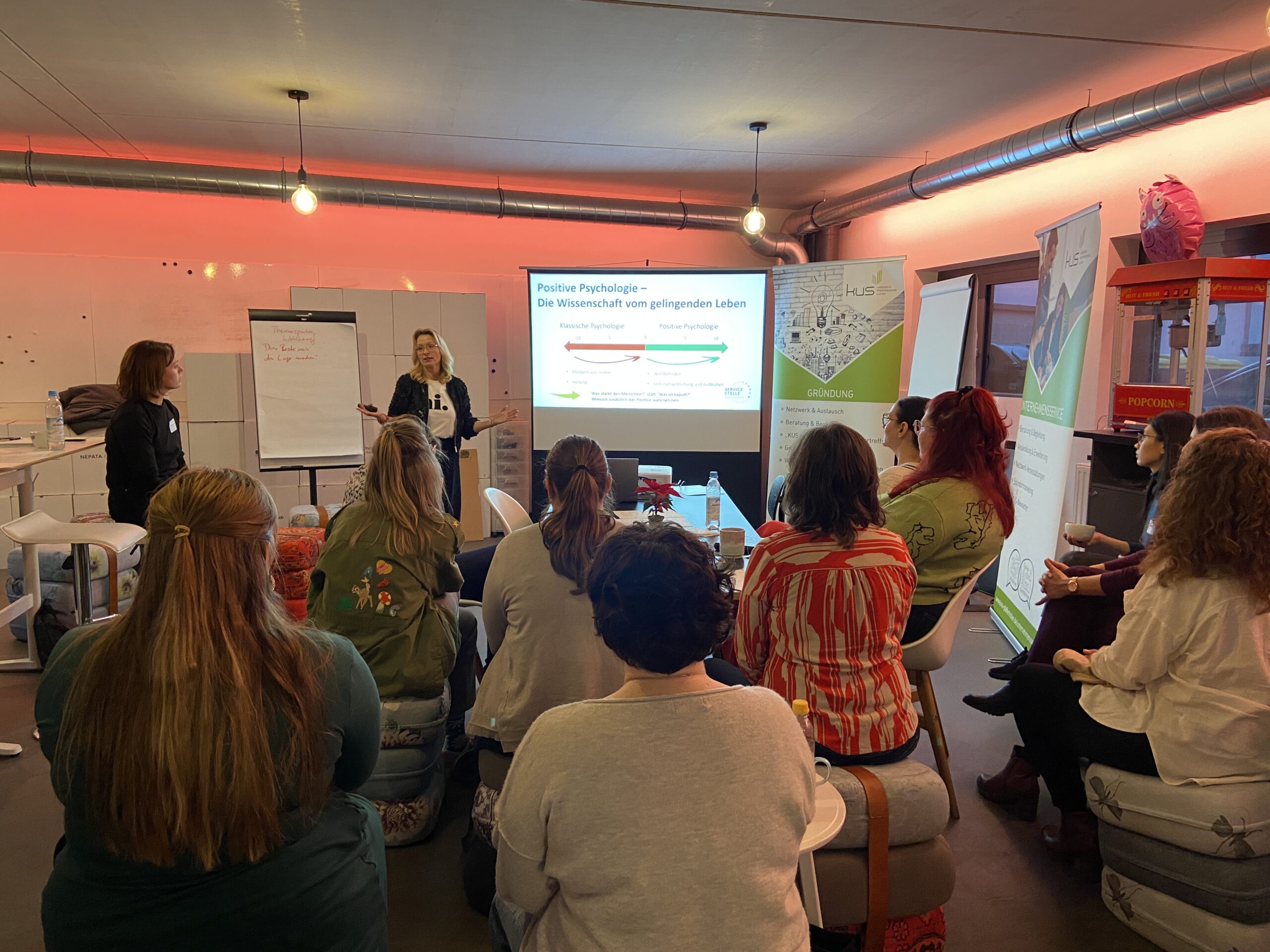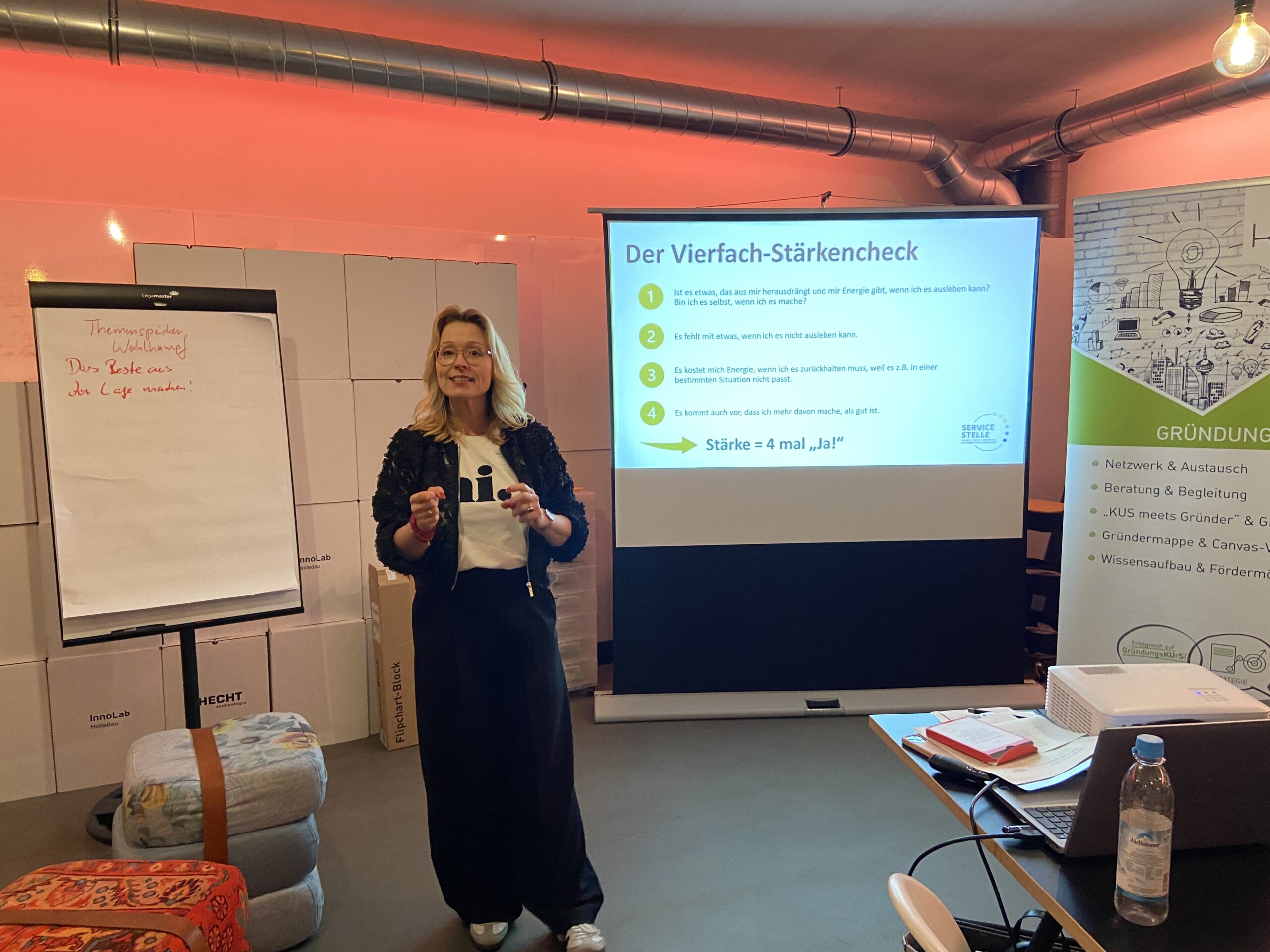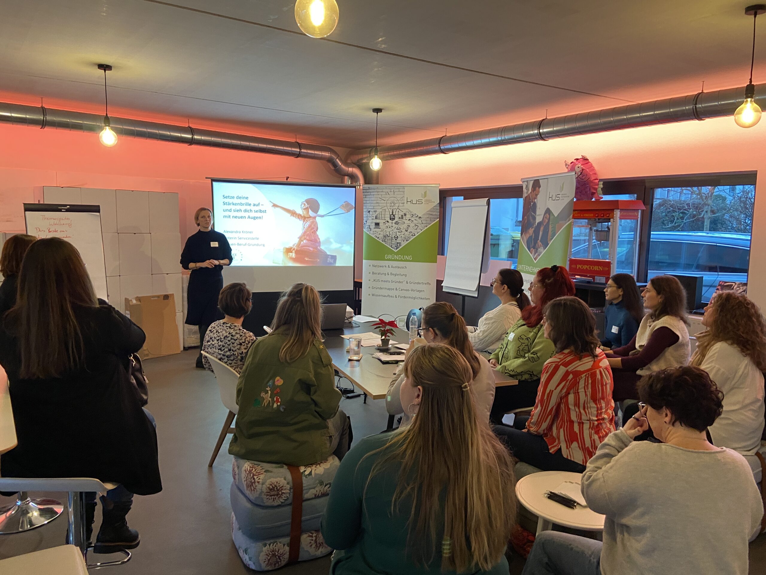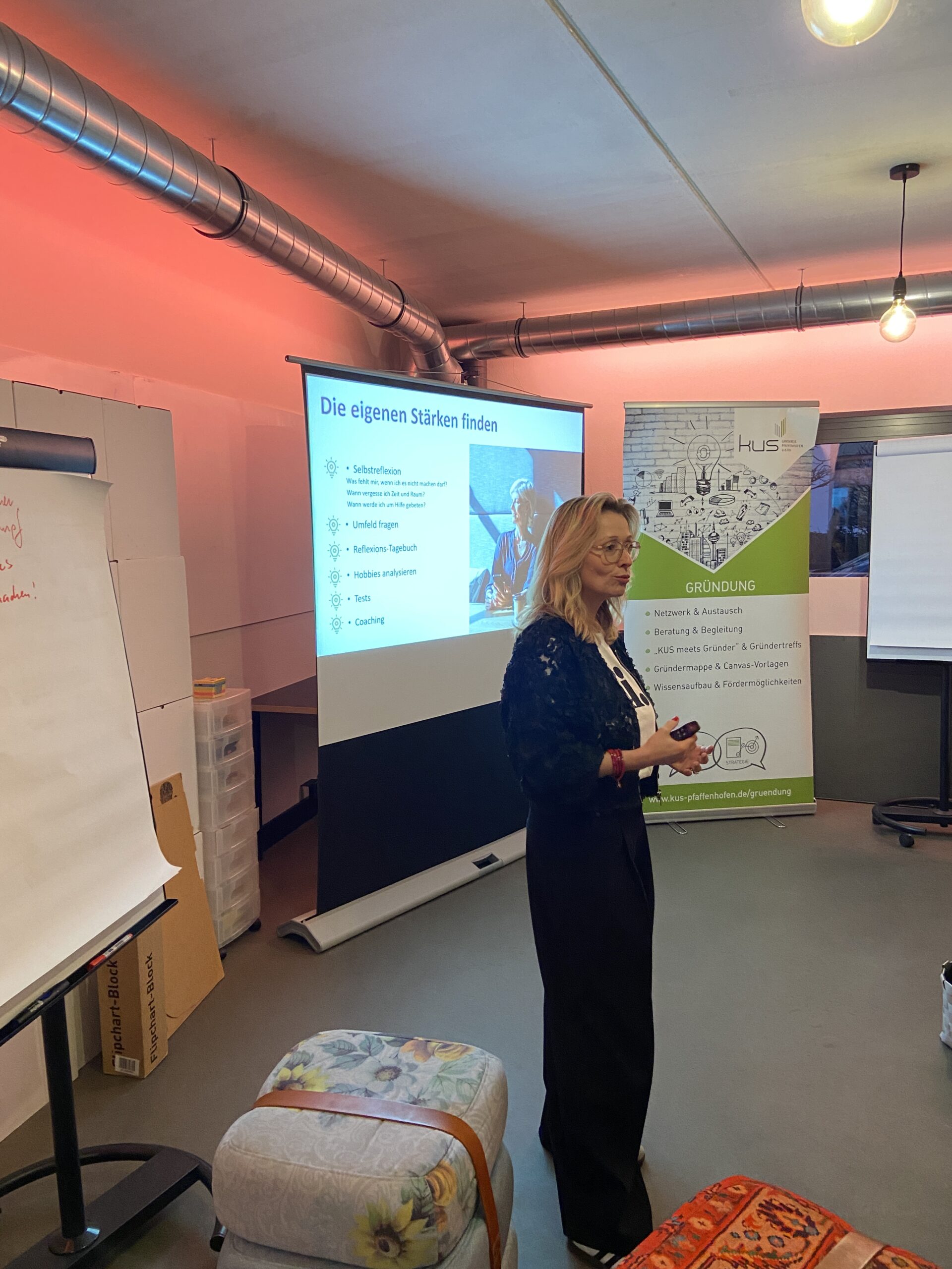 Nach einer kurzen Begrüßung durch Saskia Stadlmeir vom KUS gab Alexandra Kröner einen inspirierenden Einstieg in das Thema. Sie erläuterte den Unterschied zwischen Talenten („ich habe es“), Kompetenzen („ich kann es, weil ich es gelernt habe“) und Stärken („ich will es“) und zeigte, warum echte Stärken vor allem eines sind: das, was Energie bringt und Leichtigkeit auslöst.
